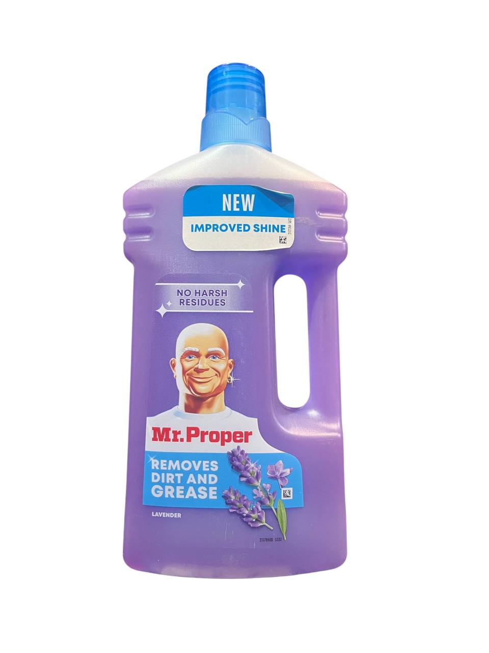 Універсальний мийний засіб Mr. Proper з ароматом лаванди впорається з різними забрудненнями і підійде майже для всіх твердих поверхонь у домі. Він підходить для чищення раковин, забруднених жиром кухонних плит і для регулярного миття підлоги. Продукт не містить відбілювача, аміаку та консервантів.